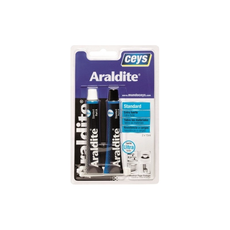 Uniones ultra-resistentes Araldit Standard es un adhesivo epoxi de dos componentes, una resina y un endurecedor, que reaccionan al mezclarse. Es el adhesivo recomendado para todo tipo de uniones de gran resistencia. Tiene capacidad de relleno. Resiste temperaturas desde -30ºC a +65ºC, resiste hasta 350kg/cm2, la mayoría de disolventes orgánicos e inorgánicos, así como golpes y vibraciones. 15 + 15 ml