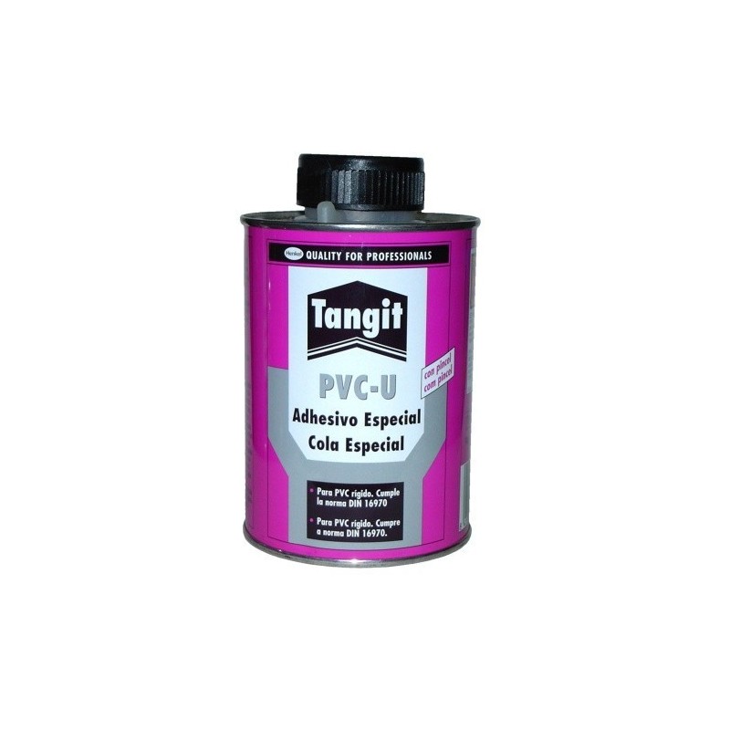 Adhesivo especial para conducciones de presión en PVC rígido. Adhesivo tixotrópico (baja viscosidad sin descuelgue) y súper fuerte para encolar conducciones y manguitos de PVC-U en saneamiento, riego y construcción en general. Propiedades: Es una disolución de PVC en combinación equilibrada de aditivos especiales y disolventes orgánicos que confieren propiedades como tixotropía, estabilidad y longevidad. Actúa físicamente sobre el PVC disolviendo la zona superficial y formando un cuerpo entre adhesivo y material. Las uniones duran tanto tiempo como el material de PVC empleado. Soportes: Uniones de tubería-tubería y tubería-manguito de PVC de presión Carpintería de PVC Canalizaciones de cables Conducciones industriales Canalización dedesagües Canalización de agua potable. Normas: ® DIN 16970 (Alemania) ® NF T 54-096 (Francia) ® BS 4346, Parte 3 (Gran Bretaña) ® NEN 7106 (Holanda) ® ASTM D-2564 (USA) ® UNE 53174 (España). Características Técnicas: Densidad: aprox. 0,96 g/ml Viscosidad (Epprecht, a 23ºC): 800-3.500 mPa·s Estructura: la estructura de Tangit es la adecuada para evitar escurrimientos y así garantizar un recubrimiento uniforme de la tubería Resistencia química: la resistencia química de Tangit es la propia del PVC. No se recomienda su uso para la conducción de ácidos fuertes. En cuanto a los ácidos débiles, la resistencia ofrecida por la unión depende de las tolerancias entre tuberías, de la presión de trabajo y de la temperatura y la concentración del ácido Resistencia a la temperatura: la resistencia a la temperatura de Tangit es idéntica a la del PVC, lo que corresponde a un límite máximo de 60ºC. Aplicaciones: Adhesivo especial para uniones resistentes y duraderas en uniones tubería-tubería y tubería-manguitos, planchas y perfiles de PVC rígido, tuberías de presión, conducciones industriales, conducciones de desagües, conducciones de agua potable, carpintería de PVC, canalización de cables...
