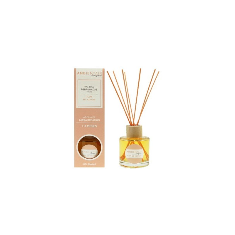 Mikado FLOR AZAHAR Mikado 100ml en botella de vidrio, con varillas de ratán naturales, con líquido de color, estuche folding con los pictogramas y textos legales correspondientes al aroma.Fragancias naturales con notas olfativas duraderas, sin alcohol