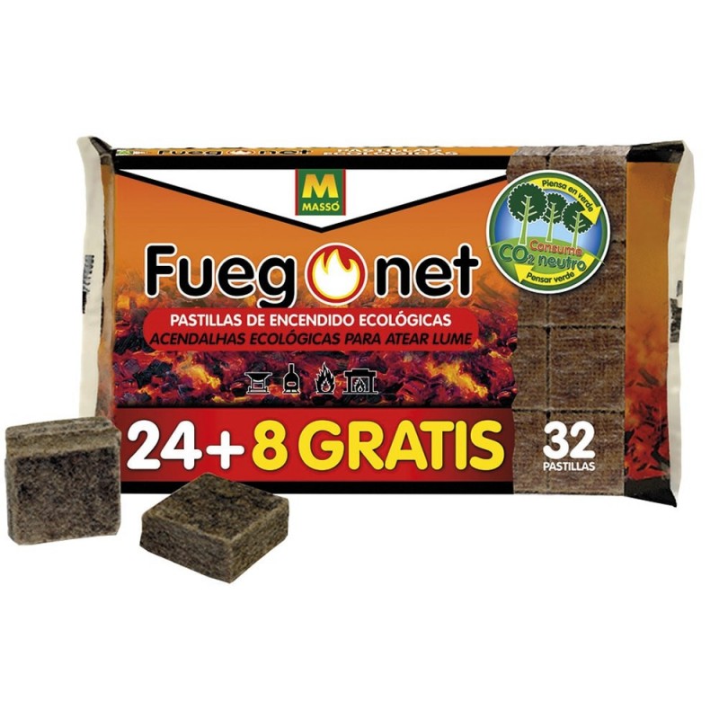 PASTILLAS DE ENCENDIDO ECOLOGICAS - ENVASE24+8 UNIDADES - (LARGA DURACION DE ENCENDIDO Y GRAN PODER CALORIFICO - COMPUESTAS DE MADERA VEGETAL Y ACEITES VEGETALES) - FUEGONET - MASSO