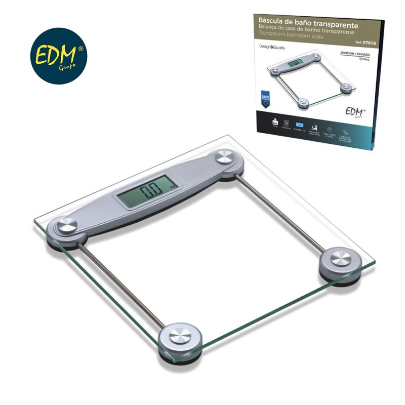 BASCULA DE BAÑO TRANSPARENTE MAX. 150KG EDM PLATAFORMA DE CRISTAL TEMPLADO 8MM/6MM PANTALLA LCD 21MM ENCENDIDO AUTOMATICO INDICADOR DE SOBRECARGA/BATERIA BAJA FUNCIONA CON 1 PILA CR2032 INCLUIDA 3V DIMENSIONES 30X30X3CM EDM