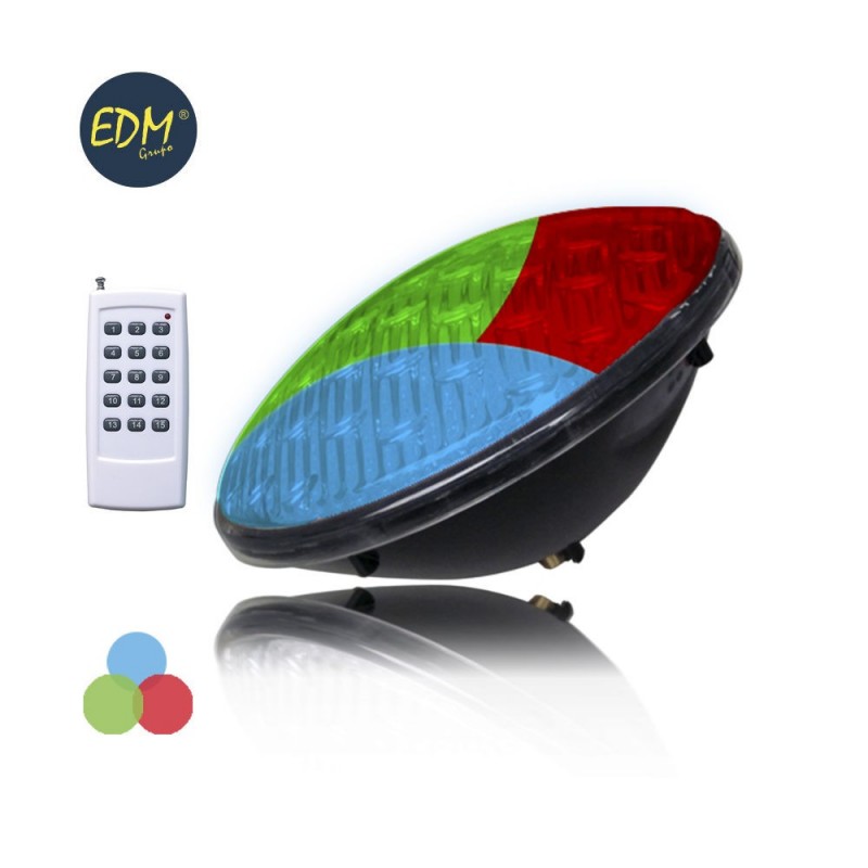 BOMBILLA PISCINA LED PAR56 9W 500 LM RGB MULTICOLOR Ø 17.6 X 6 CM 25000H 12V CLASE A+ 40° CONEXION POR TERMINALES IP68 FUNCIONA CON MANDO A DISTANCIA 15 FUNCIONES EDM