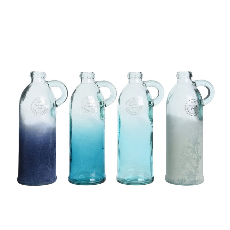 BOTELLA DECORATIVA DE CRISTAL RECICLADO COLORES DEGRADADOS SURTIDOS (AZUL MARINO, AZUL TURQUESA, AZUL CIELO Y GRIS) DIA8X22CM