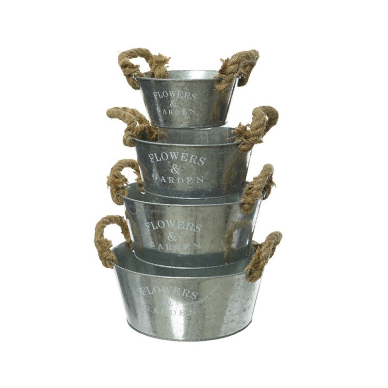 MACETERO REDONDO DE ZINC CON ASA DE YUTE SET 4 PZS DIA25X11CM, DIA.22.5X10CM, DIA19X8.5CM, DIA16X7.5CM