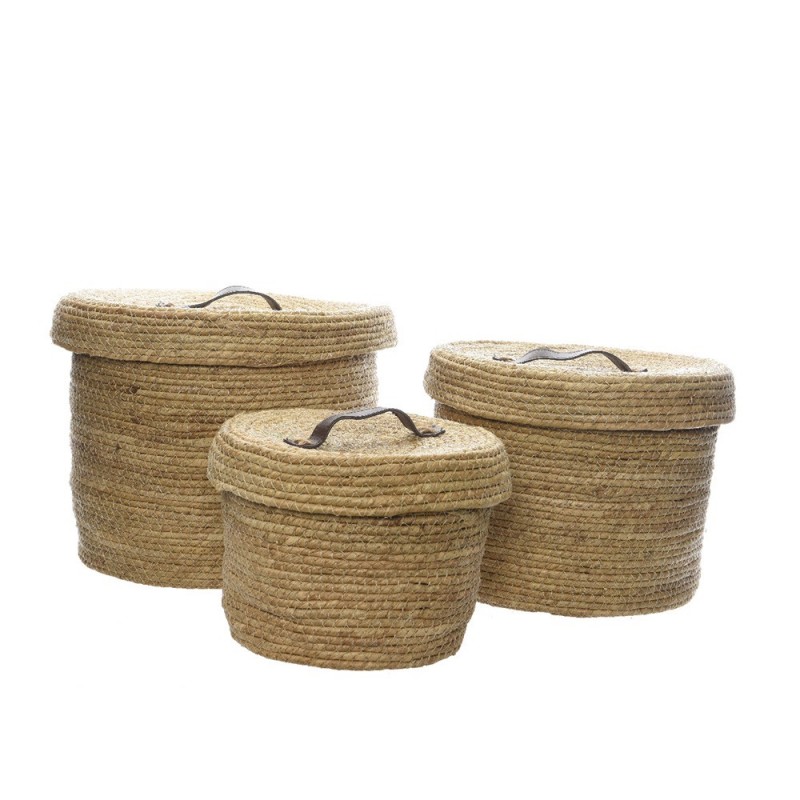 PACK DE 3 CESTOS DE FIBRA NATURAL CON TAPA Y ASA DE PIEL. TAMAÑOS: Ø32X27CM, Ø27X22CM, Ø22X17CM. COLOR NATURAL