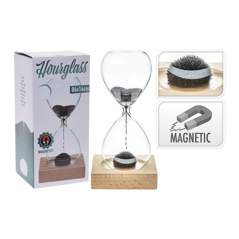 RELOJ DE ARENA MAGNETICO 6X14CM BASE DE MADERA DE HAYA 8X8X2CM AL VOLTEAR DE RELOJ LOS GRANOS DE HIERRO SE APILAN FORMANDO HERMOSAS FIGURAS DEBIDO AL IMAN INCRUSTADO EN LA BASE DE LA MADERA. DE CRISTAL