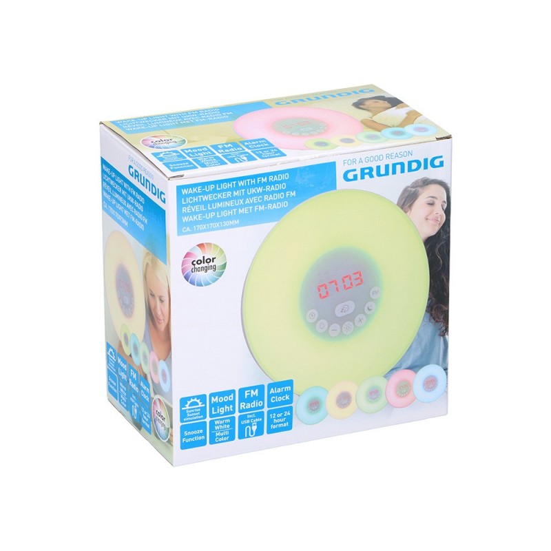 RELOJ DESPERTADOR CON LUZ Y RADIO LED GRUNDIG 17X17X13CM CON CAMBIO DE COLOR. INCLUYE CABLE USB.