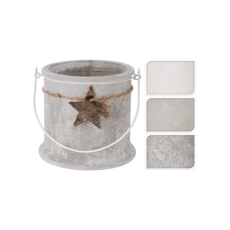 VASO PORTAVELAS 12CM COLORES SURTIDOS. DIMENSIONES: 12,3X12,5CM. 3 COLORES SURTIDOS: BLANCO, GRIS CLARO (7535C) Y GRIS. ACABADO VINTAGE. CUERDA NATURAL Y ESTRELLA DE MADERA BLANCA