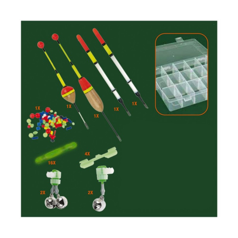 KIT PARA PESCA NOCTURNA 29 PIEZAS CON 15 DIVISORES CORTOS Y 2 LARGOS. INCLUYE 29 PIEZAS PARA PESCA NOCTURNA: 16 STICKS VERDES, 2 CAMPANAS DOBLES, 2 CAMPANAS SIMPLES, 1 BANDA DE GOMA, 1 BOYA 6G, 1 BOYA 4G, 2 BOYAS FLUORESCENTES 145MM,