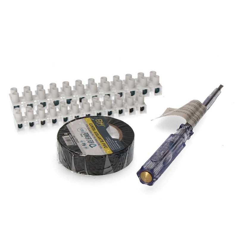 KIT FERRETERIA EDM COMPOSICION: DESTORNILLADOR TESTER , CINTA AISLANTE 10MTS NEGRA Y REGLETAS CONEXION 6 Y 10MM. IDEAL PARA PEQUEÑAS INSTALACIONES