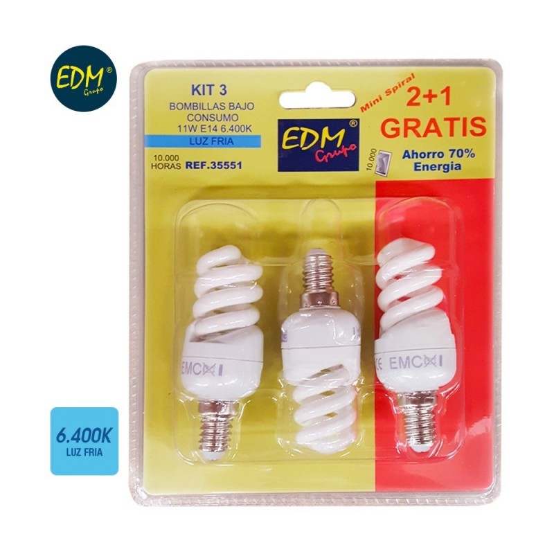 PACK 3 BOMBILLAS BAJO CONSUMO MICRO ESPIRAL E-14 11 W LUZ FRIA 6400K EDM