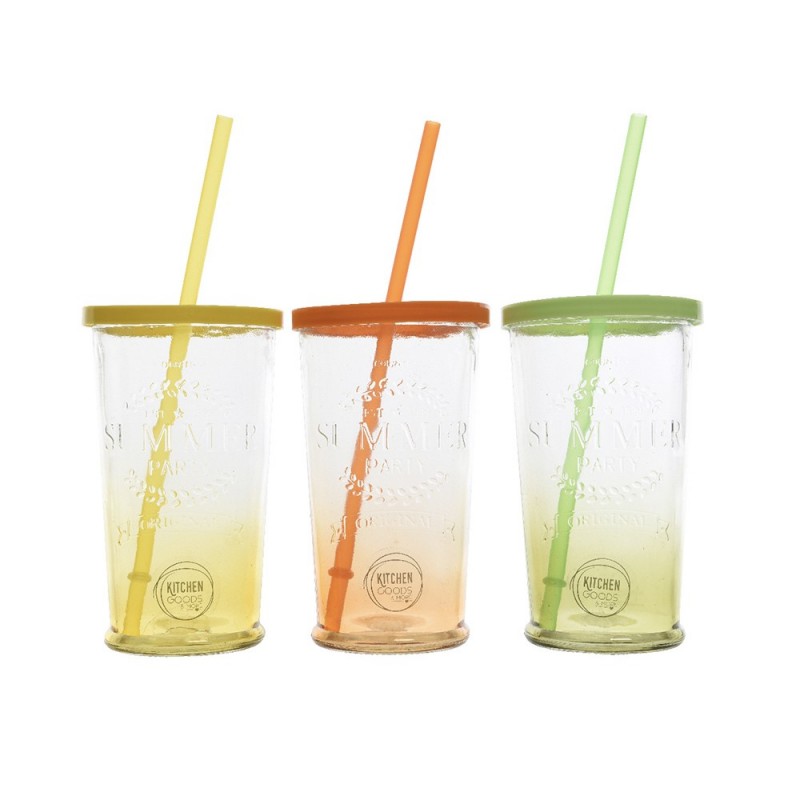 VASO DE CRISTAL CON PAJITA COLORES SURTIDOS (MELOCOTON, VERDE, AMARILLO) VOL. 460ML DIA8,7X14,8CM