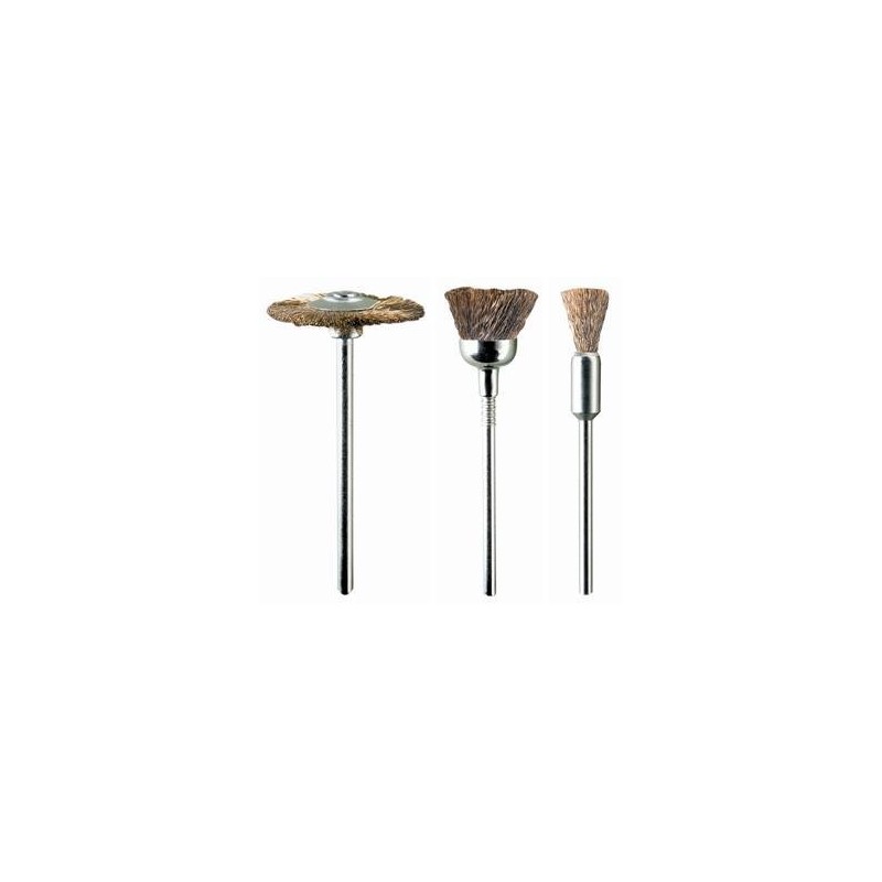 3 Cepillos surtidos en latón. Eje Ø 2,35 mm. Para pulir, repasar, limpiar madera y metales blandos tales como cobre, oro y latón, sin producir rasguños. Idóneos para limpiar componentes eléctricos.