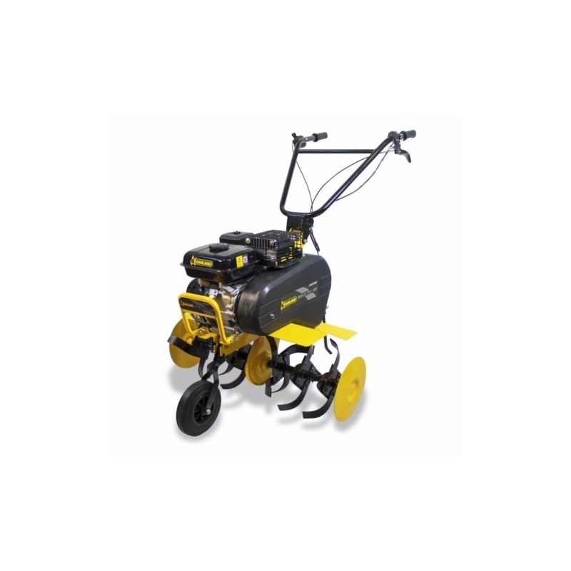 Motor 4 tiempos GARLAND de 196 cc. OHV Rotabator de 6 grupos con platos protege plantas y 80 cm. de ancho de trabajo. Monomarcha. Manillar regulable en altura. Incluye asa y rueda delantera de transporte.