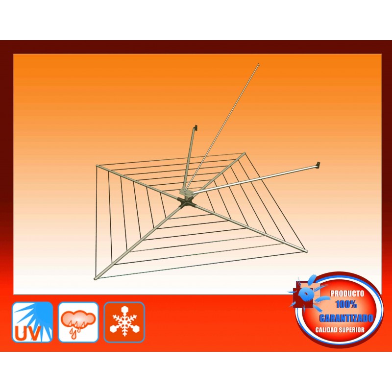 Material: acero bicromatado (color dorado), 2 brazos fijos, parrilla de tendido giratoria con cuerda plastica con alambre interior con 6 cuerdas, capacidad de tendido 18 metros, anclaje superior, tensor con cable, anclaje inferior 2 placas, medidas parrilla de tendido: lados 1,10 y diagonal 1,60m.